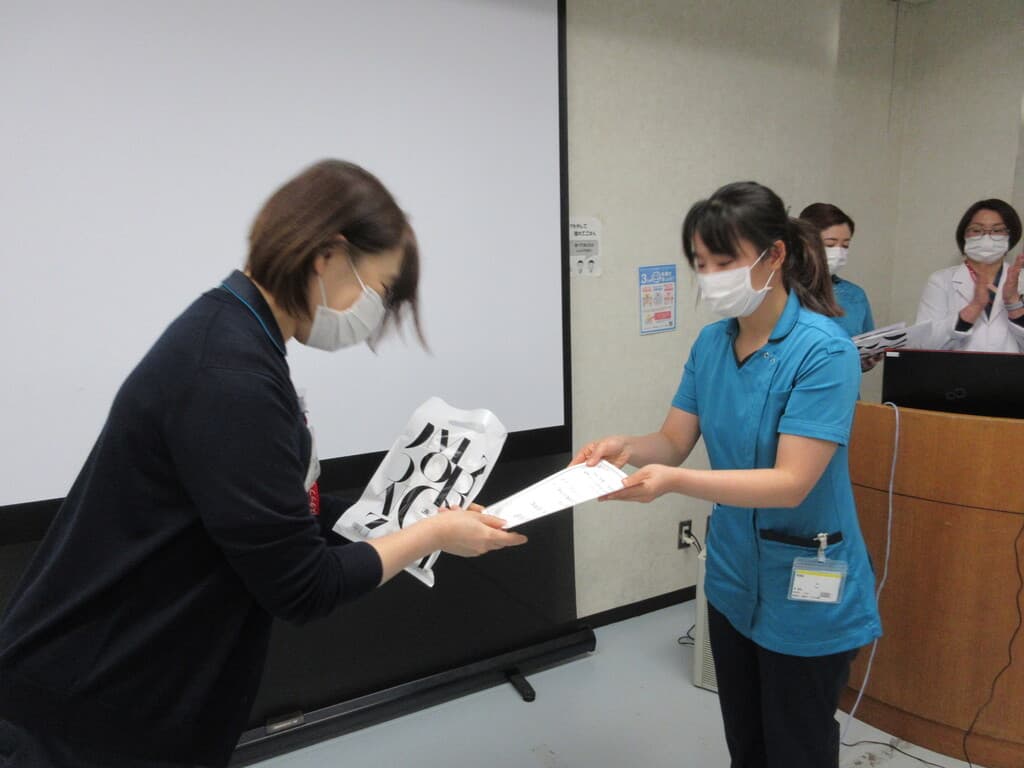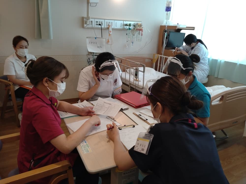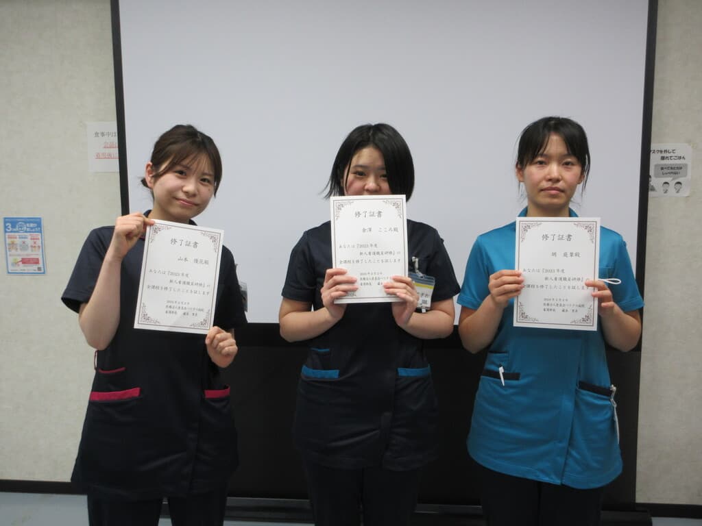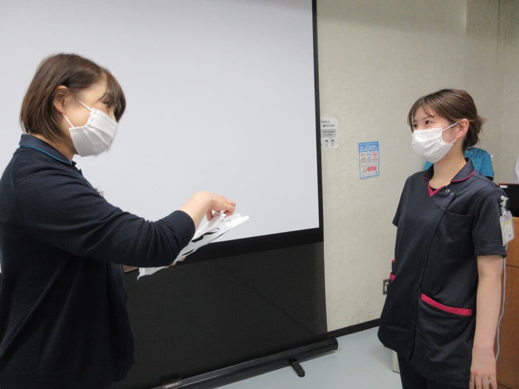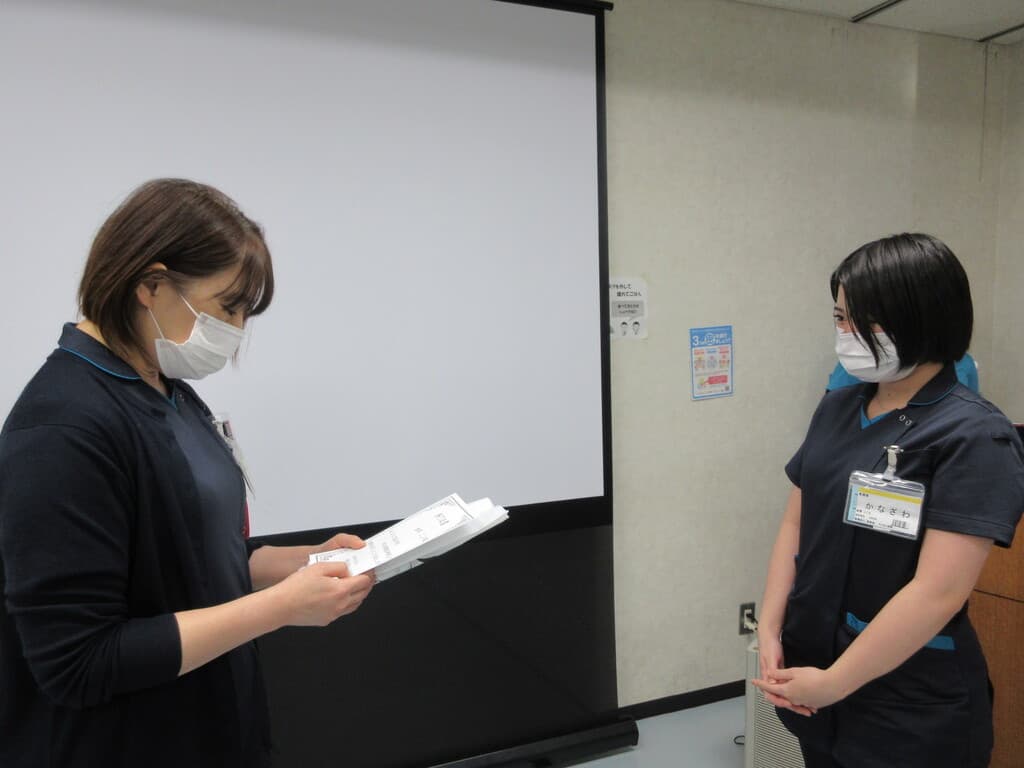 新人看護師教育システム 新人看護師研修の目的 看護部の理念、方針、 活動内容を把握し、社会人・組織人に必要な基礎知識を身につける。 新人教育スローガン 病院全体で育てよう!共に成長しよう! 支援体制 チーム支援型:部署の教育担当者・新人全体を支援するプリセプター以外には新人看護師1人に1人の指導者を付けず、チームに参画しながら新人を教育・支援します。 チーム内でそれぞれのメンバーが得意分野を指導するように役割分担がされています。 新人看護師卒後院内研修プログラム 入職式4月 入職式 (AM 院内・PM 関西3病院合同 byグランヴィア) 病院 (1日)オリエンテーション(就業規則・倫理・医療安全・感染) 看護部(5日)オリエンテーション 1ヶ月フォローアップ研修5月 1ヶ月フォローアップ研修 輸液ポンプ・シリンジポンプの取り扱い 3ヶ月フォローアップ研修6月 3ヶ月フォローアップ研修 リフレクション研修9月 リフレクション研修:ゲームをしながら、よかったこと・困ったこと、つらかったことなど同期で共有しよう 臨床心理士との面談:自身の心の内を聞いてもらおう 6ヶ月フォローアップ研修10月 多重課題1 複数患者を受け持ち、優先順位・応援依頼・フィジカルアセスメントし、判断・応援要請までを実践レベルで行います。 振り返り研修 実践後みんなで振り返り、2回目に活かして実践を繰り返す研修を実施します。 BLS・フィジカルアセスメント研修11月 メンタルヘルスケア(臨床心理士との面談) BLS・フィジカルアセスメント研修 救急看護認定看護師からフィジカルアセスメントの講義を受け、自分が実施したBLSの根拠づけと日々の観察を振り返ります。 救命士からBLSの講義を受け、実践を繰り返し行いながら、急変時の対応を学びます。 9ヶ月フォローアップ研修1月 振り返り研修2 10月に行った、多重課題1を基に、患者の急変に対して、時間切迫状況の中、優先順位・看護判断・患者への対応・応援と報告が行えることを目的にシュミレーションを繰り返し行動レベルまで落とし込めます。 1年間の振り返り2月 1年間の振り返り(看護実践発表) 事例を通して自分の看護を振り返り、1年間の頑張りに対して温かい言葉を頂きます。 看護部長から卒後研修の修了証書を受け、2年目に向けての決意を新たにします。