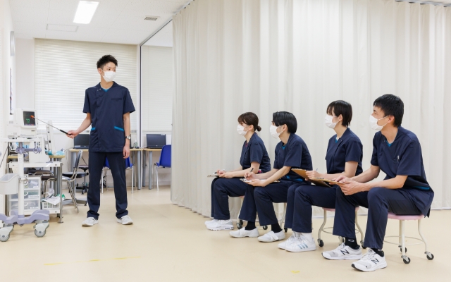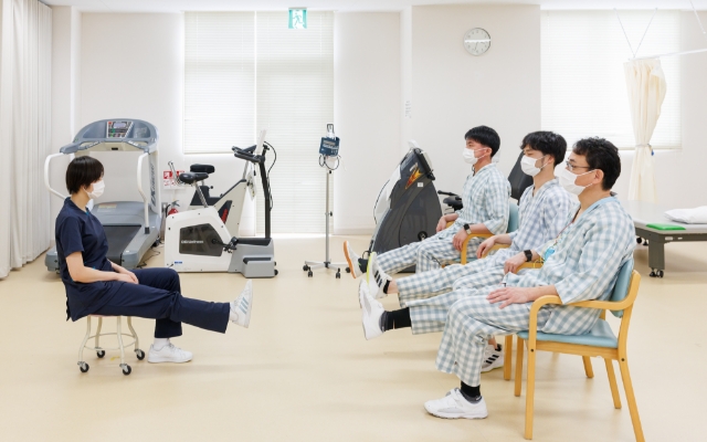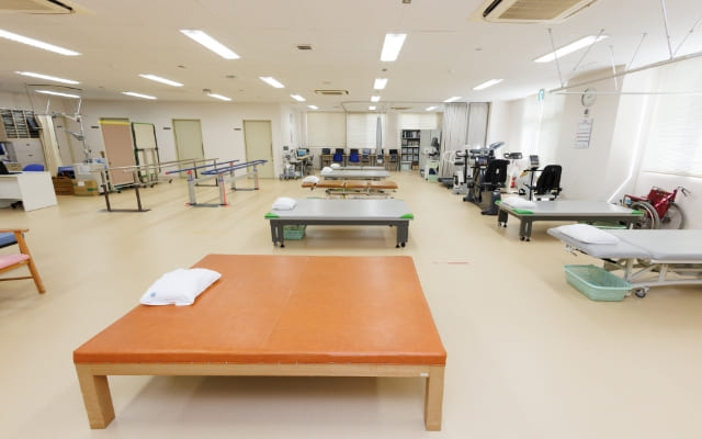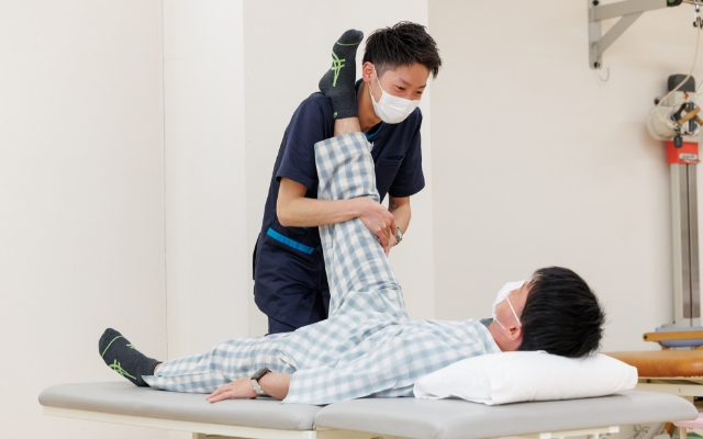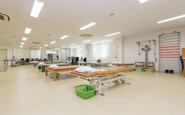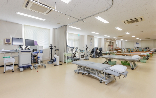 機能障害の治療と予防や基本動作獲得のため、早期ではベッドサイドにて行い、状態の安定に応じてリハビリテーション室での運動療法や